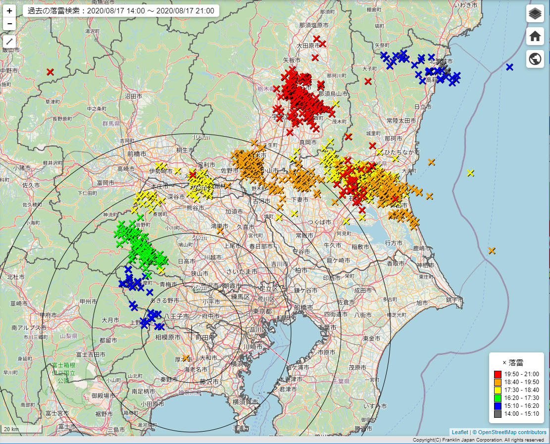 ★弊社のTwitterでは、東京駅を中心とした100km四方の落雷状況をツイートしています。