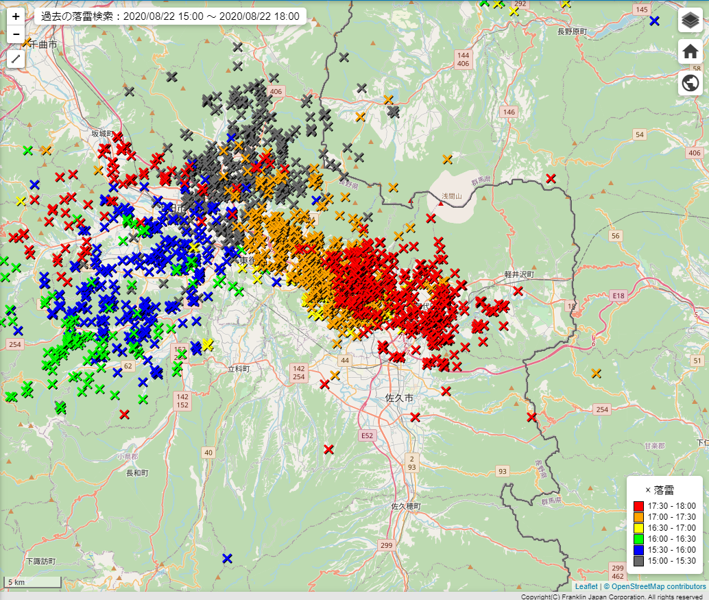 下図は、22日15時~18時の落雷状況図です。長野県小諸市付近で雷が多発していたのが分かります。