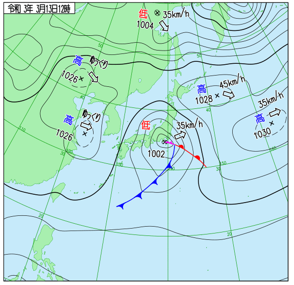 【2021年3月13日12時 実況天気図(気象庁HPより)】