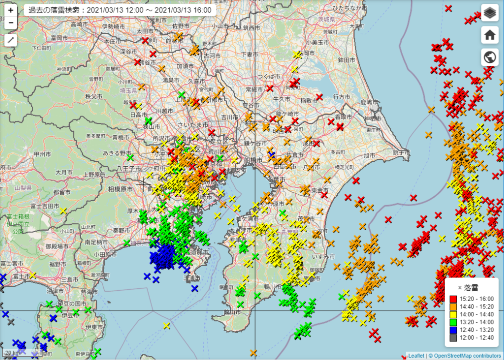 ※×印が一回の落雷を表し、落雷の発生した時間帯ごとに色分けがされています。