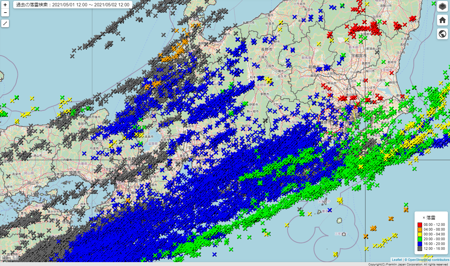 下図は、2021年5月1日12時~2日12時の落雷状況です。