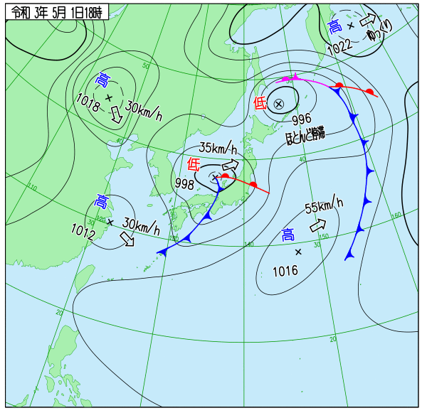 【2021年5月1日18時 実況天気図(気象庁HPより)】