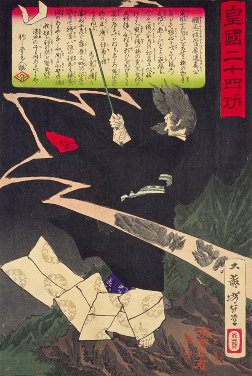 ▲雷神となった菅原道真の姿を描いた「皇国二十四功 贈正一位菅原道真公 月岡芳年 」