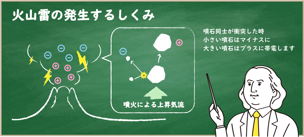 噴火では非常に強い上昇気流が発生します。そのとき、小さくて軽い噴石や火山灰は上のほうに、大きくて重い噴石は下のほうに集まります。すると、上にマイナスの、下のほうにプラスの電荷領域が作られます。このプラスとマイナスの電荷領域の間や、空気と地面との間で通電して、雷が発生するのです。