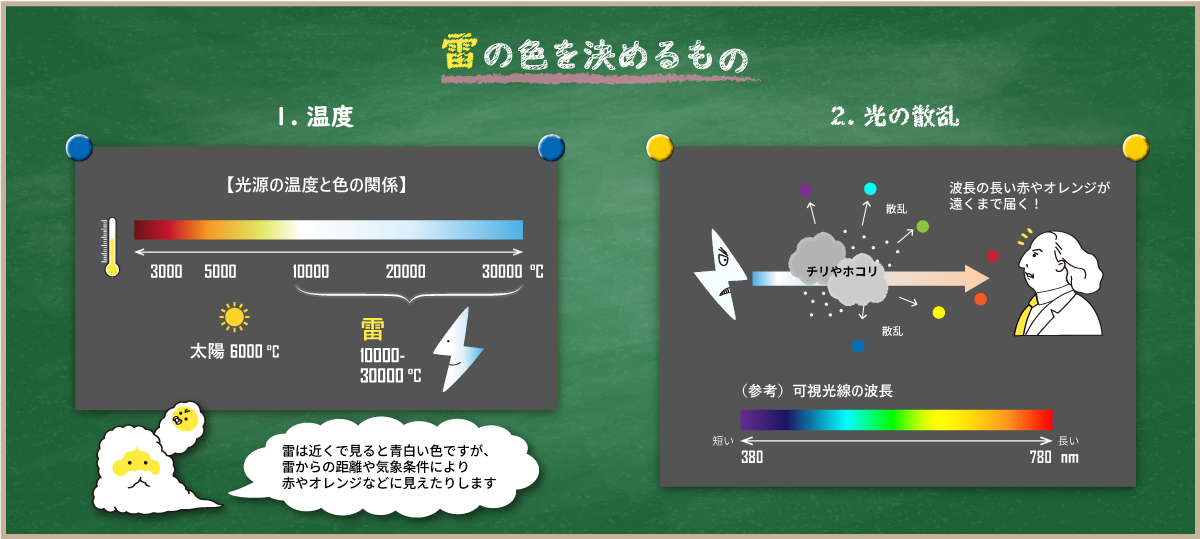 さて、雷光は絵では黄色に描かれることが多いのですが、実際の雷の写真を見ると、青白かったり、オレンジ色だったりとさまざまです。雷の色の決め手のひとつは、雷の通り道の温度と深くかかわっています。