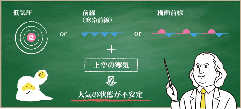 これに対して、夜に雷が鳴る状態というのは、低気圧や前線が接近したとき、そして梅雨前線が活発化しているようなときです。その際、上空に強い寒気が流れ込むと、大気の状態が不安定になり、上昇気流が発生して夜でも積乱雲が発達やすくなります。