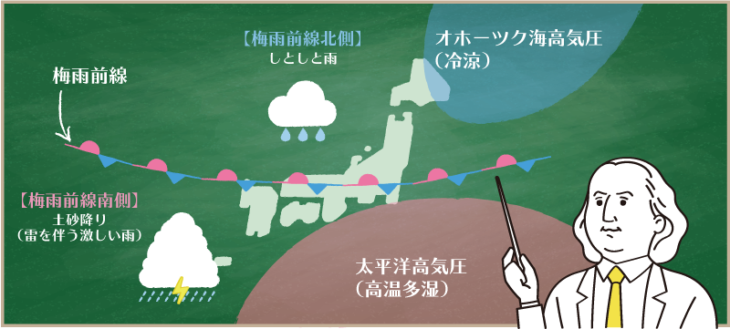 梅雨前線は、北の涼しい空気でできた高気圧と、南の高温多湿な高気圧の境目にできます。梅雨前線の北側は、乱層雲(雨雲)による雨が降りやすいです。乱層雲からの雨は、しとしとと静かに降る雨で、雷が発生することはありません。