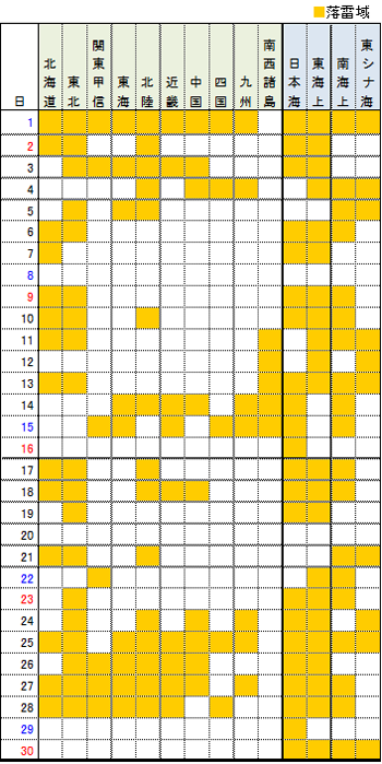 11月の落雷の数は、月としてはほぼ平均的でした。陸・海上部ともに全く観測のない日が2日も出現しました。