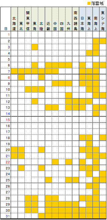 中旬頃は全く落雷の無い日が続いたり、月を通しては、洋上だけで観測した日も多く、多い・少ない日の差が顕著な月となりました。