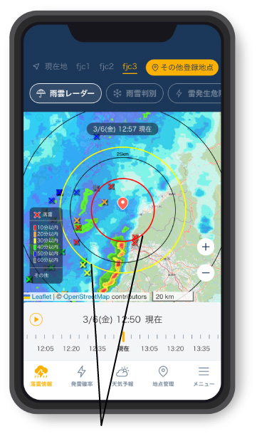 落雷があると、地図上に×印で表示。雷雲の発生場所がひと目で分かります。