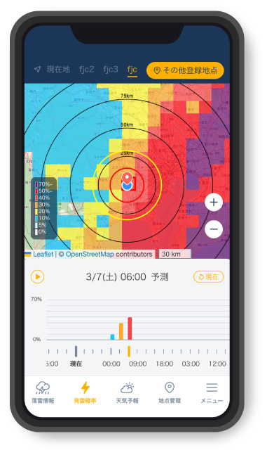 落雷や雨雲の接近をはじめ、風速や暑さ指数(WBGT)、気象庁発表の注意報·警報まで幅広くカバーしています。