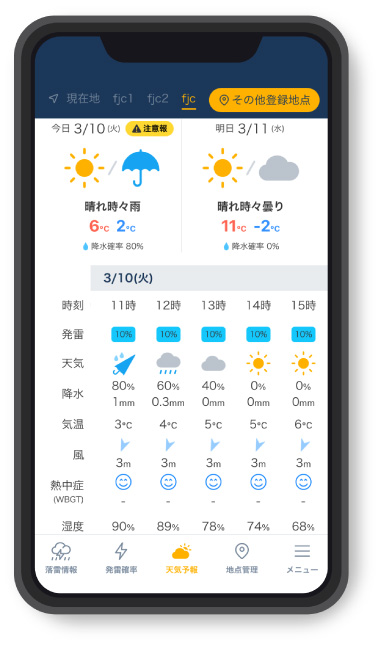 72時間先までの天気·発雷確率·降水量·気温·風向風速·湿度·暑さ指数(WBGT)を1時間ごとに表示。また、気象庁から注意報や警報が発表されている場合は、同画面上に表示されます。
