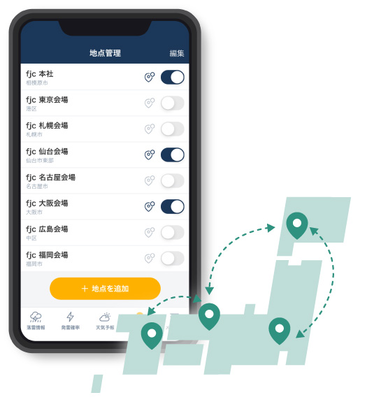 登録地点数は無制限。移動先や各現場の天気をスムーズに確認。