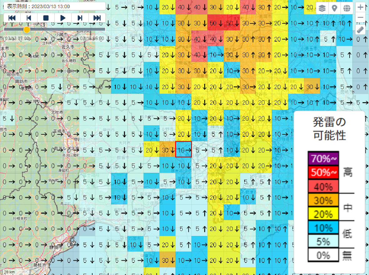 発雷の確率を、約10kmのメッシュで8段階に色分け表示。予測は、9時間先までは1時間ごと、72時間先までは3時間ごと。