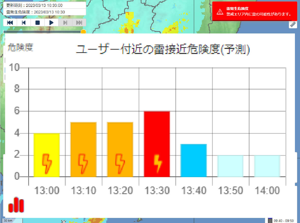 画面下のバーでは、監視地点の5分ごとの雷発生危険度を表示。