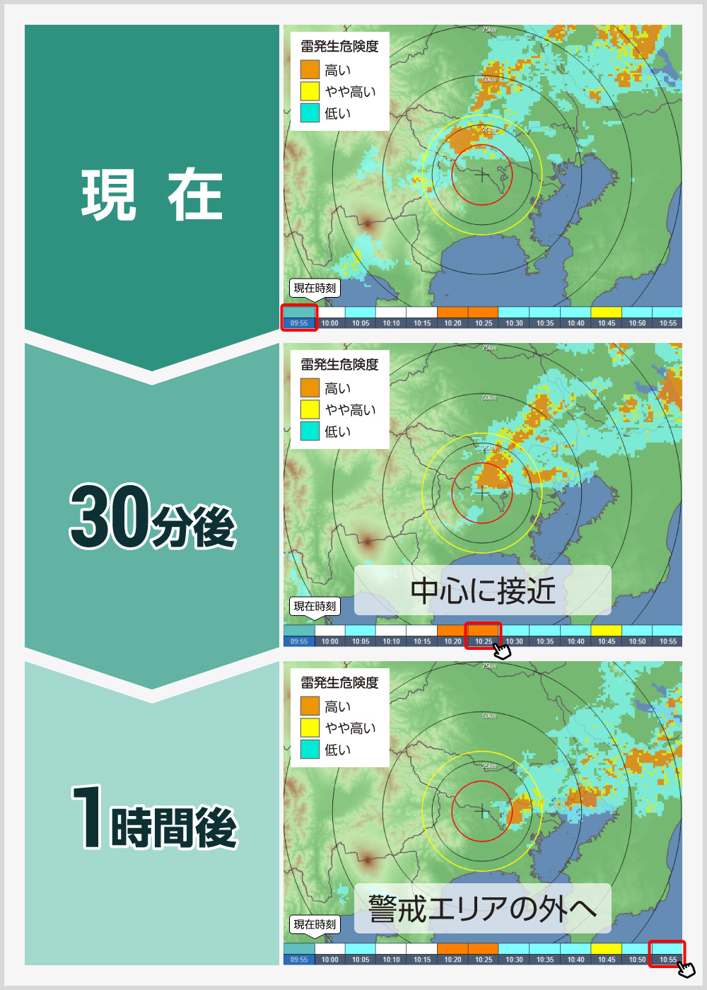 →雷雲がいつごろ通り過ぎるのか、今後の見込みをたてる。