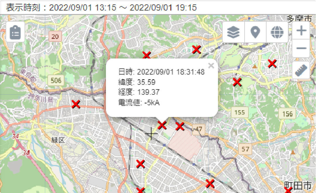 落雷があった地点に、瞬時に×印が表示される。さらに監視エリア内に発雷があると、アラート音とメール両方でお知らせ。落雷の×印は時間帯ごとに色分け表示。