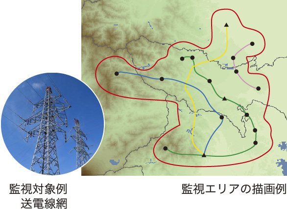 落雷の影響を受けやすい送電網などの監視拠点や対象物を、画面上に表示可能。指定の監視対象物を描画(※1)や、監視エリアの形状変更(※2)等のカスタマイズも可能です。