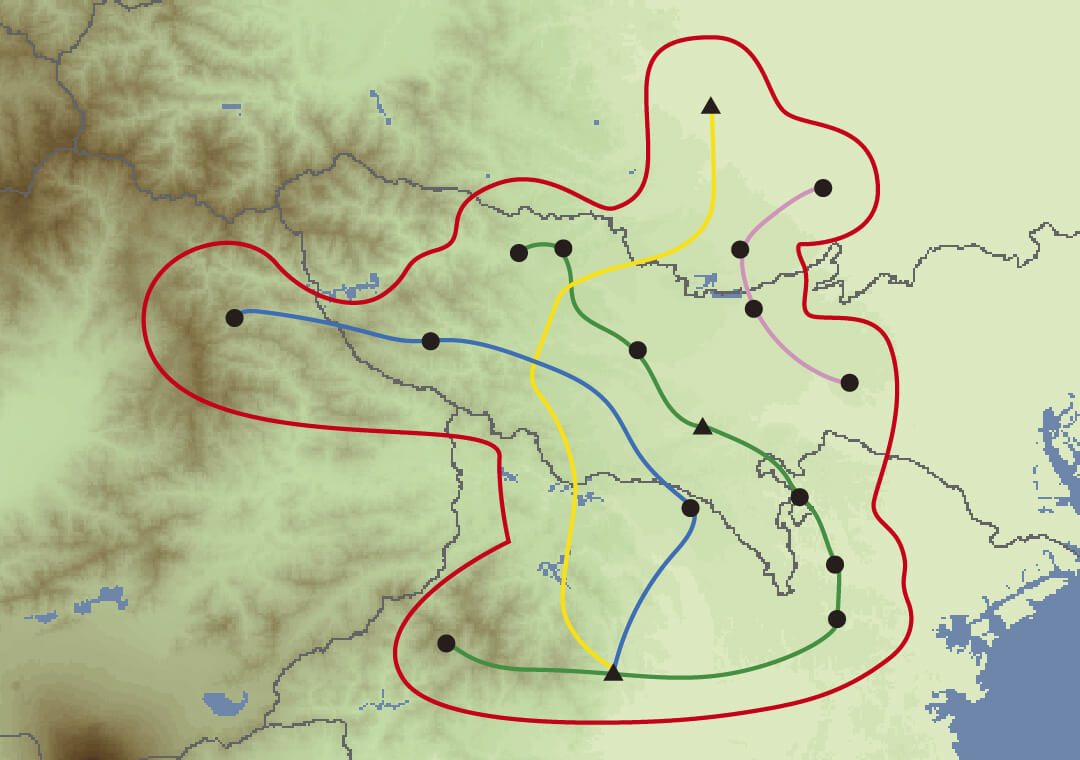 【監視エリア】監視地点を囲む赤や黄色の同心円