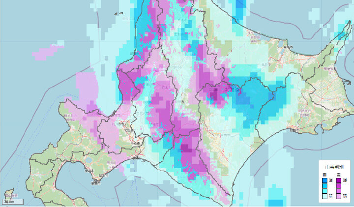 また、「雨雪判別」に切り替えると、降水エリアを雨・雪(みぞれ)に識別し、マップ上で色分けして表示します。さらに、メール通知機能も備えているため、画面を常に監視する必要がありません。