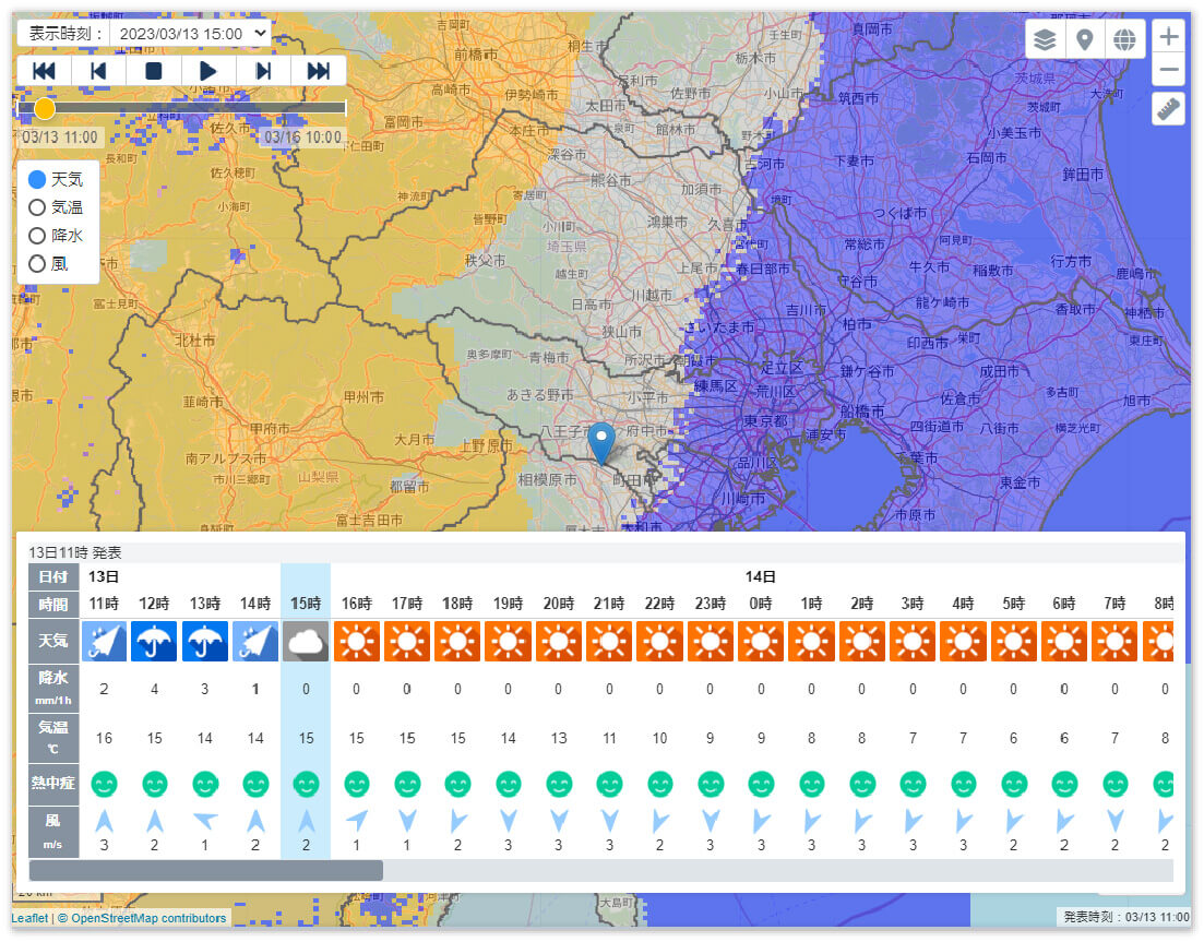 「雨雲レーダー」の「降水強度」を選択すると、24時間前から15時間先までの降水情報を表示します。