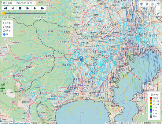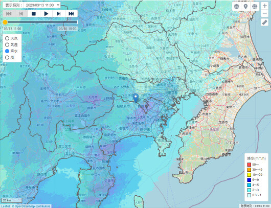(表示間隔は、24時間前~1時間前は30分ごと、1時間前~1時間先は5分ごと、1時間~15時間先は1時間ごととなっており、直近の時間帯ほど詳細な雨雲情報を取得できます。)