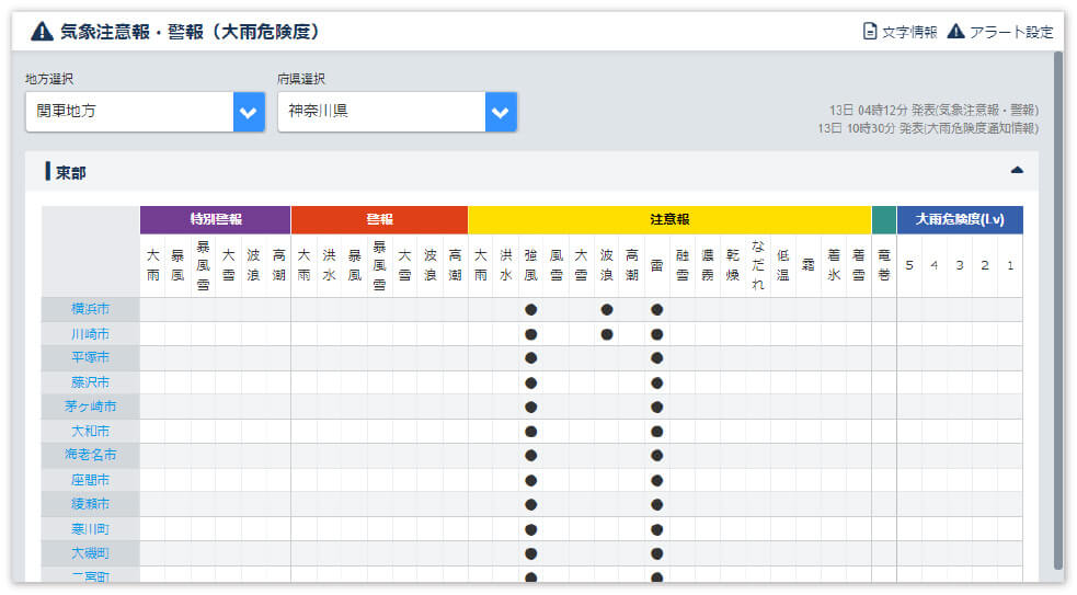 台風、地震、津波、火山の噴火など災害情報も幅広いコンテンツをご用意しています。メール通知設定が可能です。