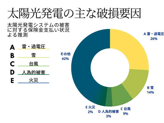 一般社団法人日本雷保護システム工業会の報告によると、太陽光発電の破損の主な原因は雷であり、全体の約26%を占めていることが判っています。