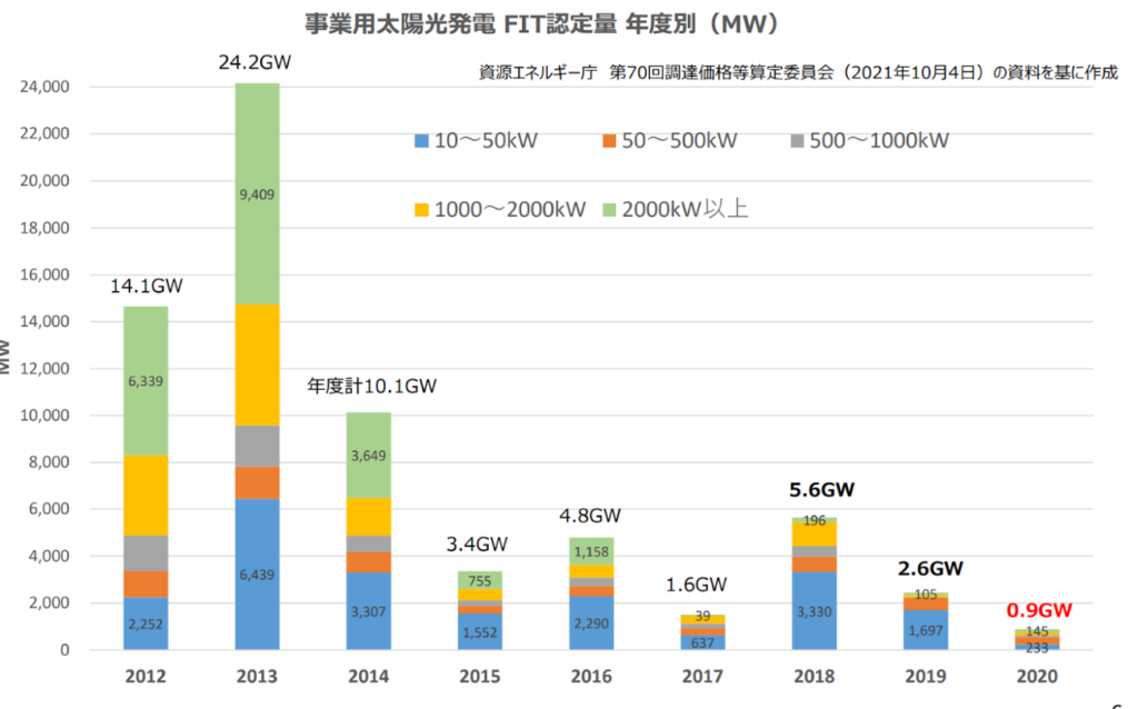 事業用太陽光発電は2014年度、2015年度において年度合計で8GWを超える導入量を記録しました。以降、2022年度までの新規導入量も5GW/年程度を維持しており、見かけ上では太陽光発電事業は順調に見えます。一方で事業用太陽光のFIT認定量は2015年度以降減少しており、2022年度には1.5GWまで大きく減少しています。